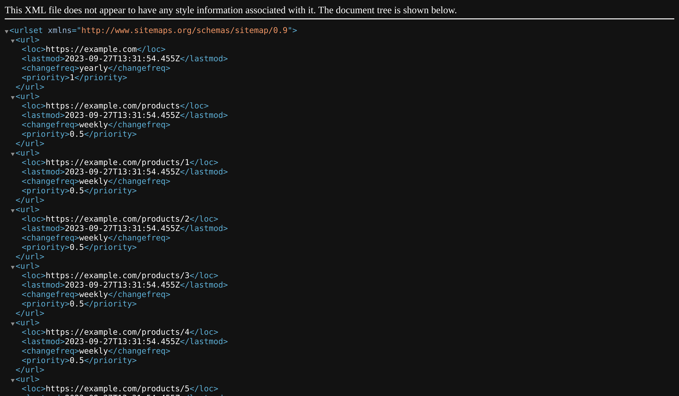 If you go to http://localhost:3000/sitemap.xml, you will see a sitemap file, as shown in the image below.