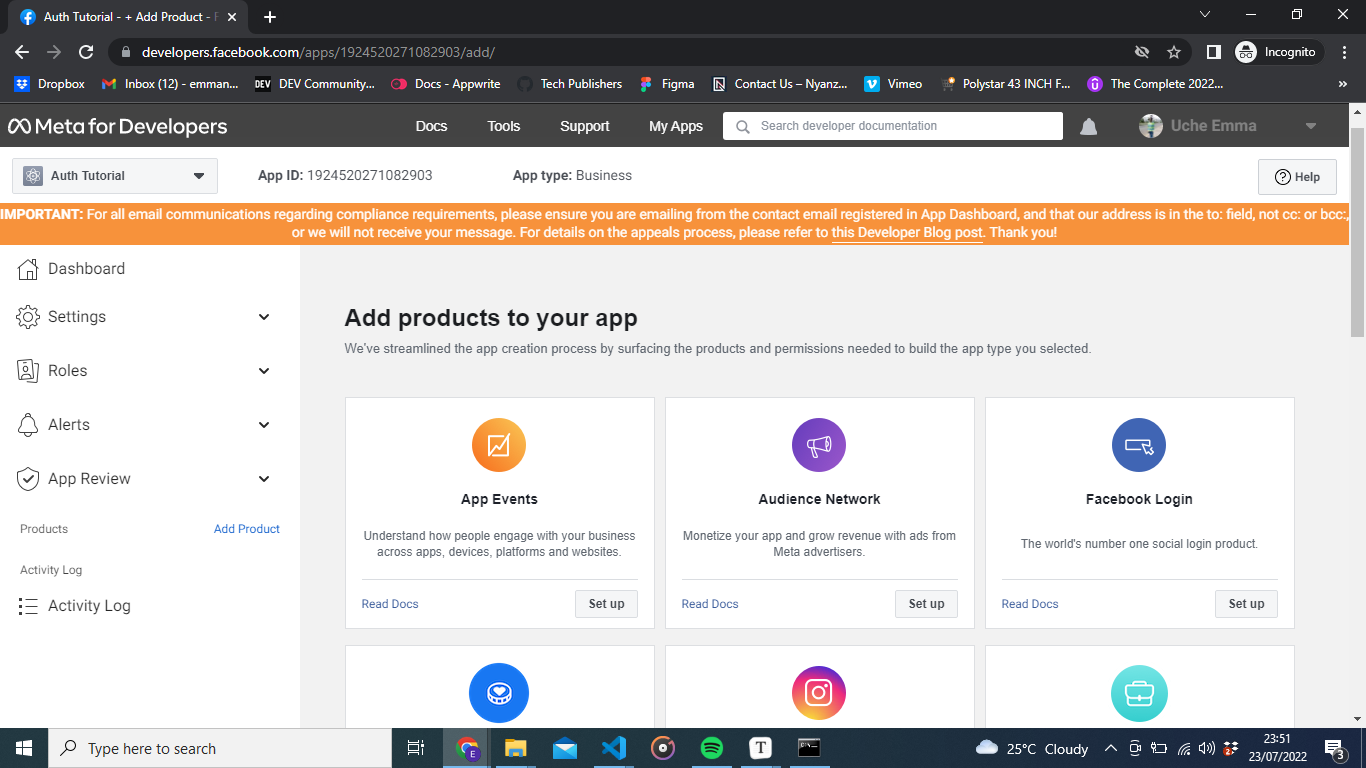Here you can see that our app has been created. We have our app name on the top left and our app id. Click on the Facebook Login so we can set up the Facebook login feature on our app.